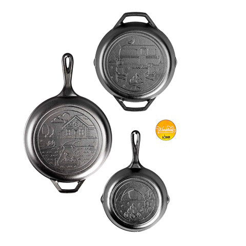 Includes: 8 Inch Cast Iron Tent Skillet, 10.25 Inch Cast Iron Dual Handle Camper Pan, 3.2 Quart Cast Iron Cabin Combo Cooker, Wanderlust Logo Sticker